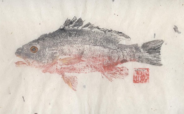 Gyotaku , a form of nature printing , was first known in Japan as a means of recording an exceptional catch. The name , loosely translated means "fish rubbing". This Mangrove snapper is a common fish in the shallow salt water estuaries and sand flats of Florida and the Bahamas. Although there are a few variations of method , the easiest and most common process of fish rubbing requires obtaining a fresh fish , washing and drying it thoroughly and applying ink or paint directly to the fish. Handmade rice paper is then positioned on the fish and every fin, gill, and scale is meticulously rubbed to transfer the ink of paint impression from the fish onto the rice paper. This gives great detail to admire the wonders of the natural world